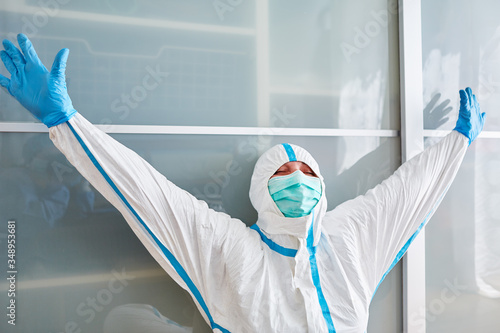 Arzt mit Schutzkleidung bei Coronavirus Pandemie stützt sich an Fenster