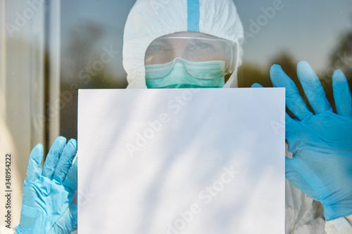 Ärztin in Schutzkleidung während Covid-19 in einer Sprechblase