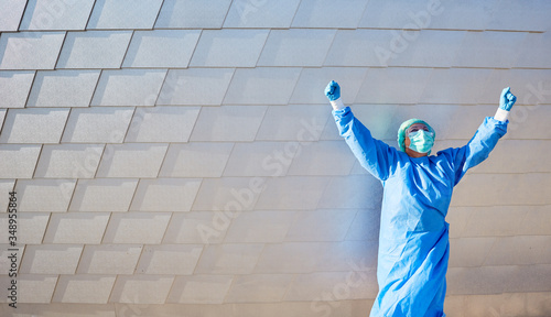 Doctor cheers with clenched fists in front of clinic in protective clothing