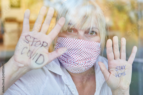 Elderly woman holds hand with stay home message at window in coronavirus pandemic