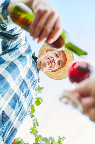 Winzer mit einer Flasche Rotwein bei Weinprobe