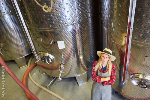 Junge Frau als Winzer Azubi vor einem Gärtank