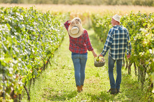 Paar mit Glas Rotwein bei Weinprobe im Weinberg