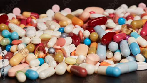 Colorful pills and medicines drugs in a heap