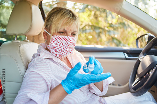 Seniorin mit Mundschutz wegen Coronavirus am Steuer ihres Autos