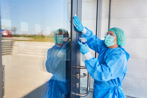 Reinigungskraft bei Desinfektion von Tür einer Klinik wegen Covid-19