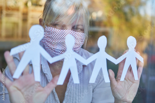 Elderly woman holding paper cut to window during Covid-19 pandemic