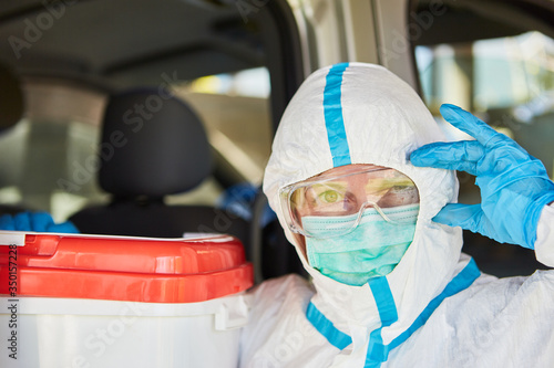 Sanitäter mit Liste zur Kontaktverfolgung im Rettungswagen