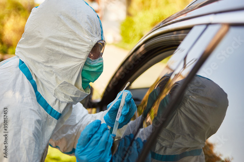 Mediziner präpariert Coronavirus Schnelltest in Drive-In Teststation