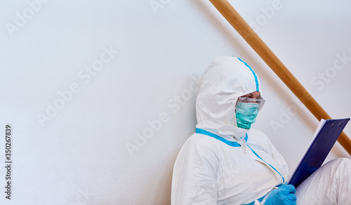 Doctor in protective clothing takes a break because of coronavirus pandemic stress