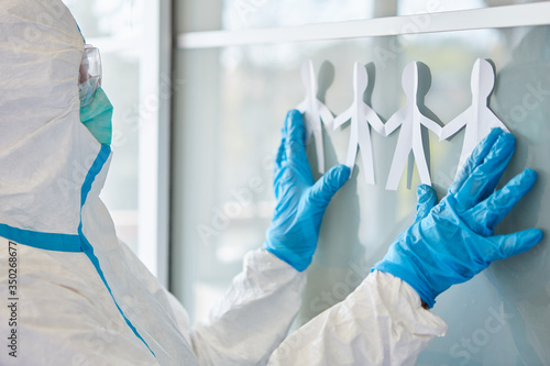 Ärztin in Schutzkleidung während Covid-19 in einer Sprechblase