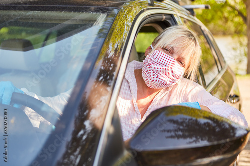 Seniorin mit Mundschutz beim Auto fahren für Coronavirus Hausbesuch