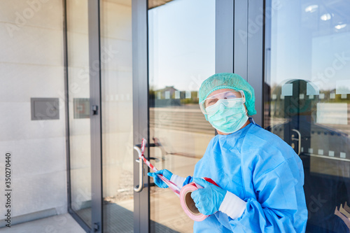 Reinigungskraft sprüht Desinfektionsmittel vor Tür einer Klinik wegen Covid-19