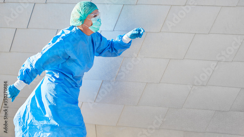 Mediziner mit ausgestreckten Händen vor Klinik in Schutzkleidung