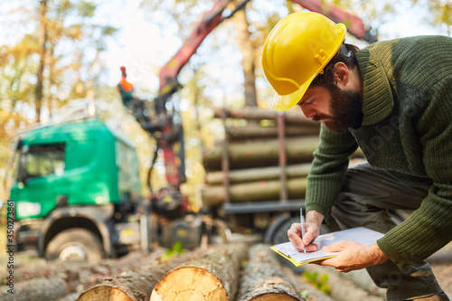 Waldarbeiter mit Checkliste beim Verladen von Holz