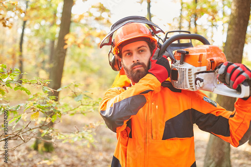 Holzfäller mit Motorsäge und Schutzkleidung im Wald