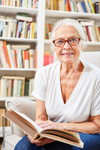 Neugierige Seniorin in der Bücherei liest ein Buch