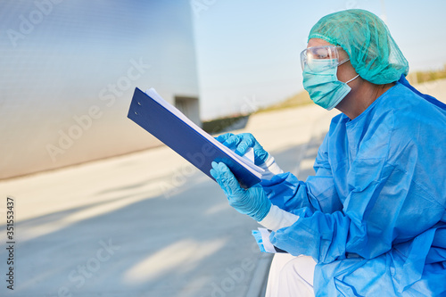 Containment Scout studiert Liste zur Kontaktverfolgung vor Klinik