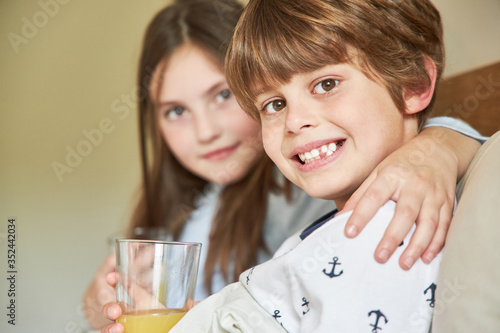 Kind als fröhlicher Lausbub trinkt Orangensaft