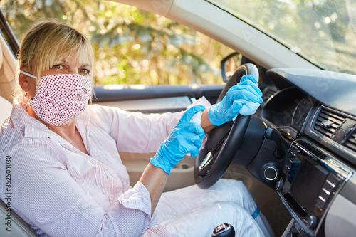Putzkraft desinfiziert und wischt Lenkrad von Mietwagen wegen Coronavirus
