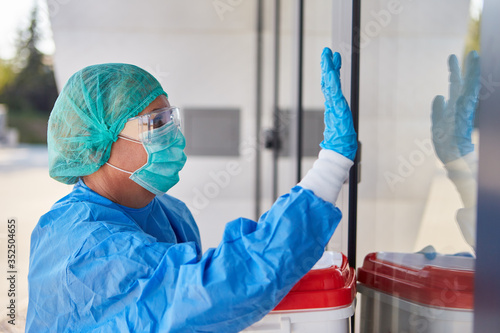 Abfallentsorgung in Mülltonne von Klinik mit Schutzkleidung