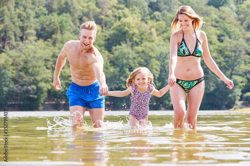 Familie mit Tochter beim Baden im See