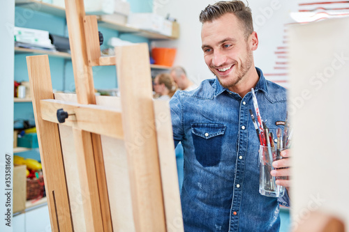 Kreativer Mann beim Malen an Leinwand auf Staffelei
