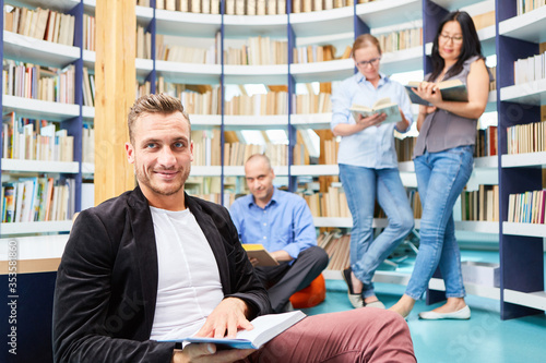 Junger Mann mit anderen Studenten beim Buch lesen