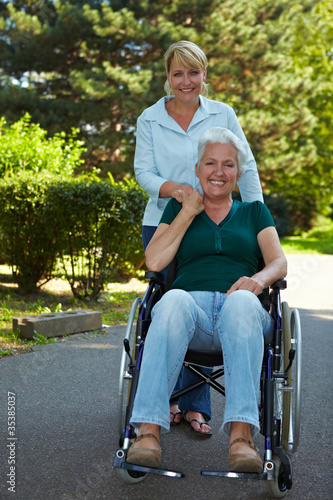 Altenpflegerin schiebt behinderte Seniorin im Rollstuhl