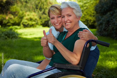 Frau im Rollstuhl zeigt Daumen hoch