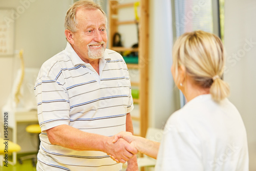 Senior als dankbarer Patient schüttelt Ärztin die Hand