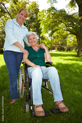 Fröhliche Altenpflegerin schiebt alte Frau im Rollstuhl