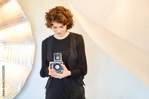 Junge Fotografin kontrolliert Kameraeinstellungen
