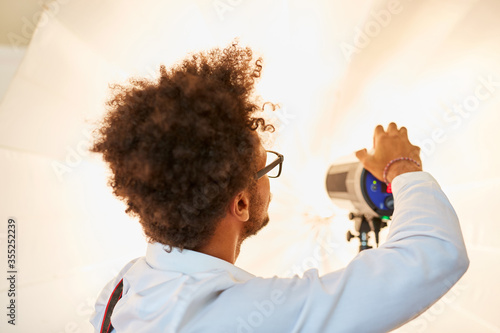 Fotograf bereitet Blitzanlage und Studioleuchte vor