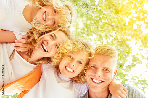 Familie zeigt bunte Zeichnung mit Eigenheim
