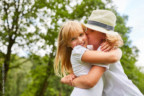 Familie zeigt bunte Zeichnung mit Eigenheim