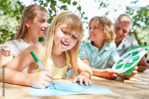 Familie zeigt bunte Zeichnung mit Eigenheim