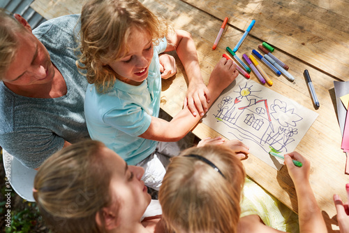 Erzieherin malt zusammen mit Kindern