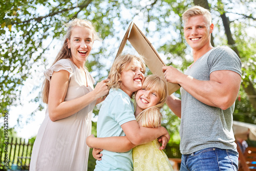 Familie zeigt bunte Zeichnung mit Eigenheim