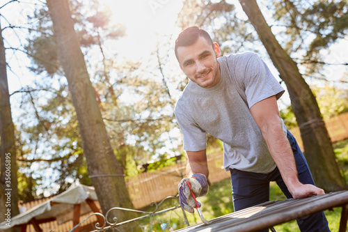 Junger Mann als Heimwerker beim Fenster abschleifen