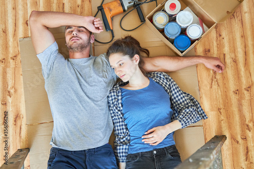 Erschöpftes junges Paar schläft ein beim Renovieren