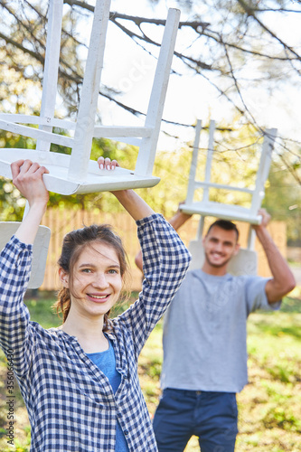 Junge Frau trägt mit ihrem Freund eine Tischplatte