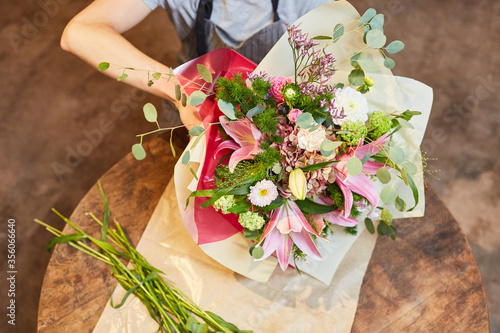 Floristen Team gibt Blumenstrauß an eine Kundin