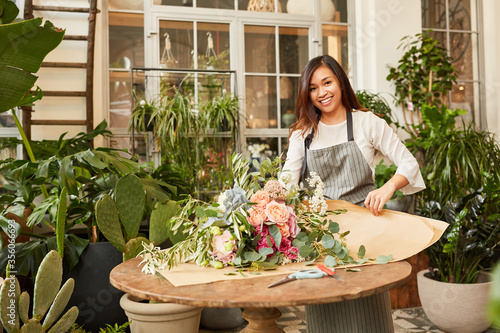 Young florist wraps big bunch of flowers