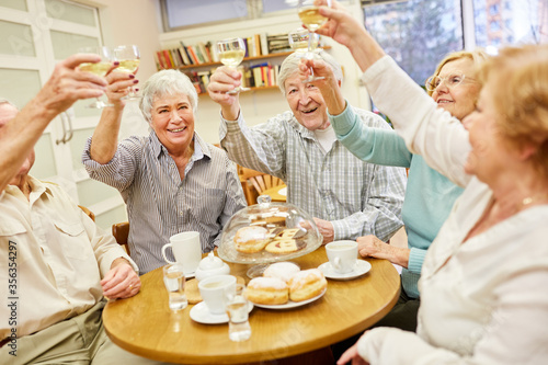 Gruppe Senioren stößt mit Weißwein an und feiert Geburtstag bei Kaffee und Kuchen