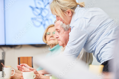 Ärztin oder Therapeutin hilft Senioren beim Schreiben in der Schreibtherapie