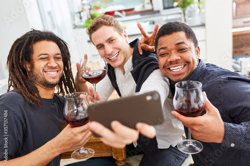 Lachende Männer als Freunde machen Selfie mit Smartphone bei Glas Rotwein