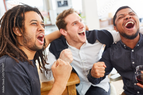 Befreundete Männer jubeln zusammen beim Fußball schauen