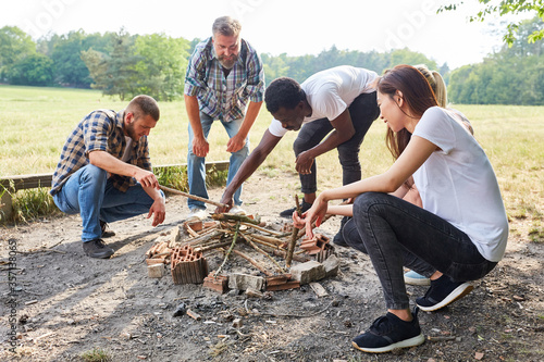 Mutter und Kinder pflanzen einen Baum zusammen im Wald