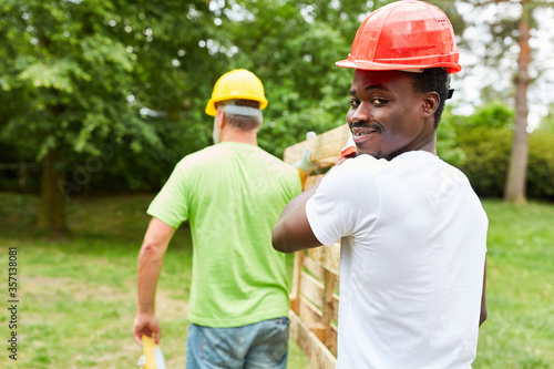 Construction worker team carries transport pallets